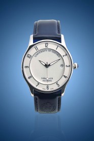 - Leather strap in navy blue or black, featuring the University of Oxford crest and 'University of Oxford Collection' on the buckle